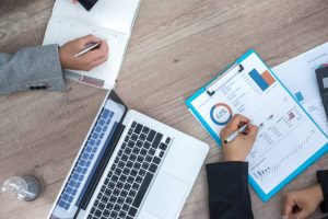 Two business people calculate their business in the office.
